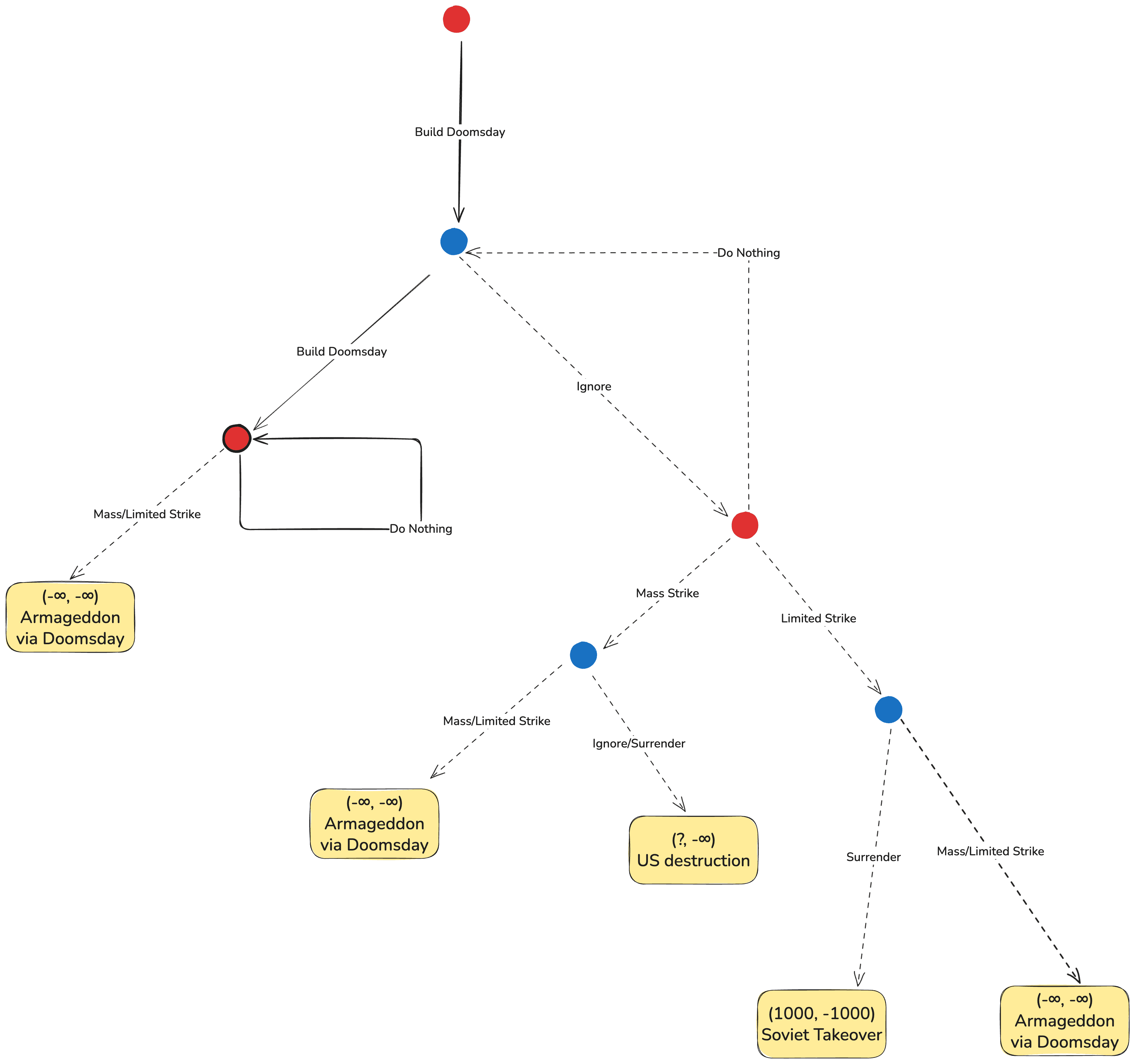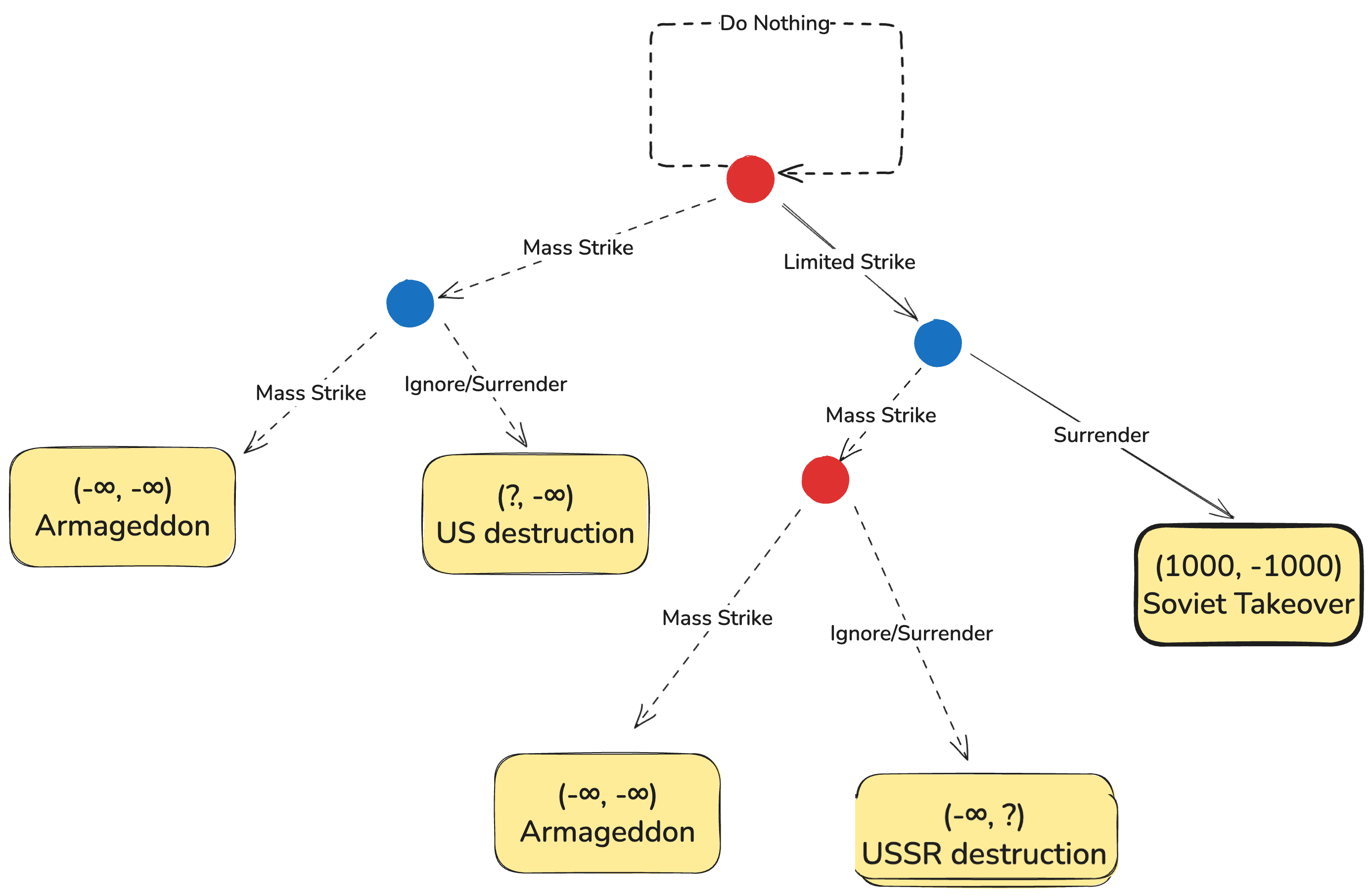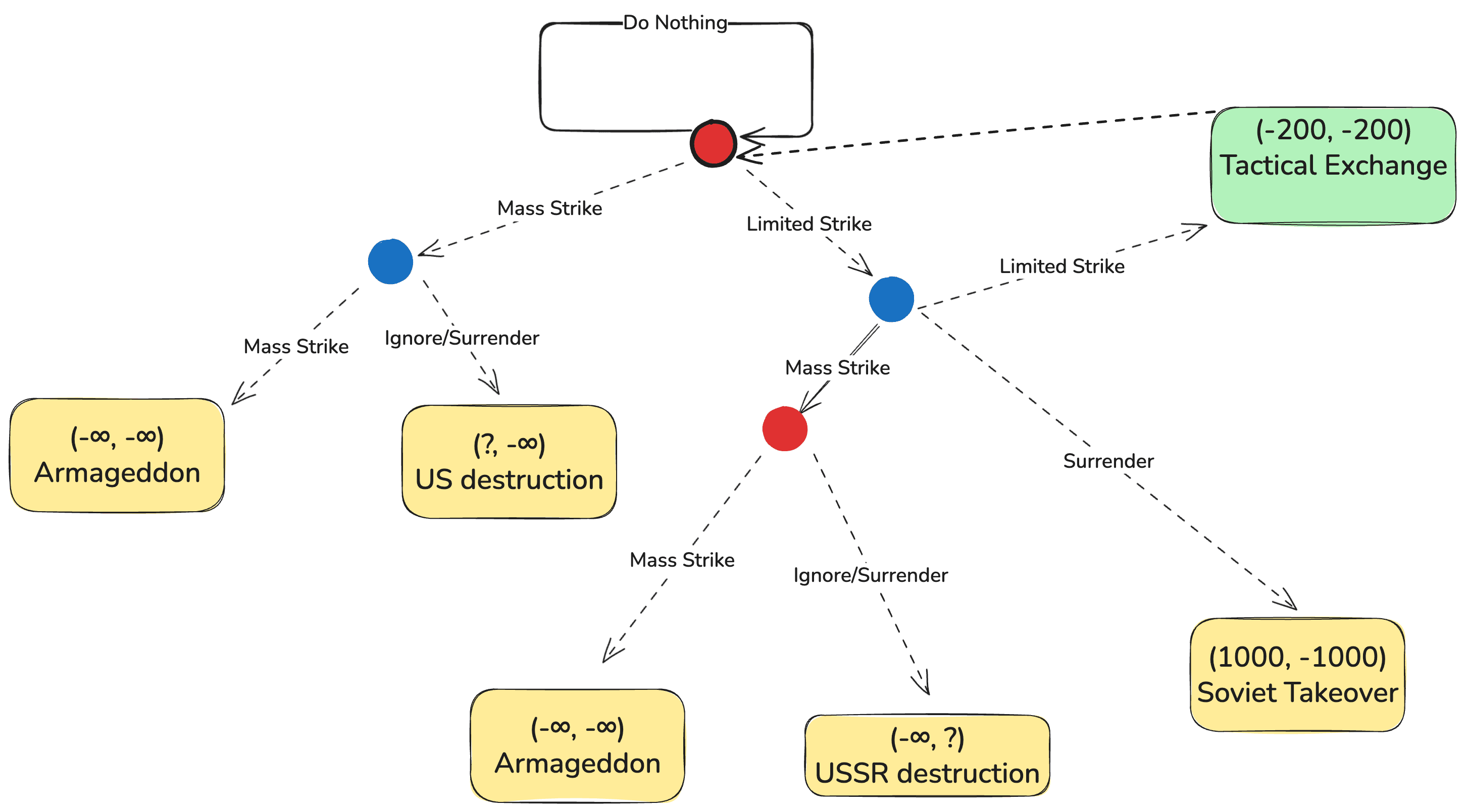 Enter Jack Kennedy, who gives us another option, the so-called “flexible response.” Basically we expand our little black book to allow answering a limited strike with a limited strike. This doesn’t lead to a terminal state, but we can safely say both sides incur a penalty. And just like that, our start state is a Broderick Equilibrium!